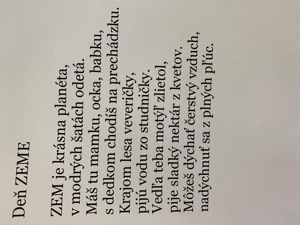 Deň 22. apríl je už tradičný ako Deň Zeme. Máme radi našu planétu Zem, našu krajinu, prostredie v ktorom žijeme, a preto nám leží na srdci čistota a poriadok nášho okolia. Tento deň je veľmi významný pre všetkých ľudí, pretože si ho pripomíname ako je dôležité chrániť prírodu, a že rovnováha všetkého živého na tejto planéte je vzácna a obdivuhodná. Počas týždňa sme spoznali nových kamarátov z knižky o Smeťkovi, naučili sme sa triediť odpad, zabavili sa pri rôznych aktivitách k tejto téme a dnes sme sa s deťmi symbolicky zapojili do zbierania odpadkov v najbližšom okolí materskej školy a popri tom hľadali Smeťka, Pliešku, Plastičku a sklo, na ktorom sa porezal Ježko Dežko. Veľmi sa nám to všetkým páčilo :) Buďme deťom príkladom a chráňme prírodu a ZEM spoločne...